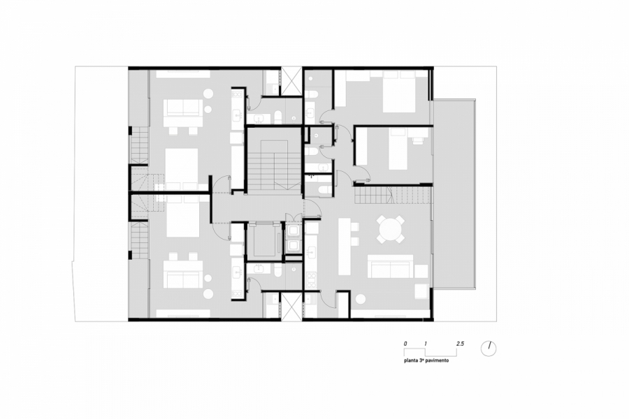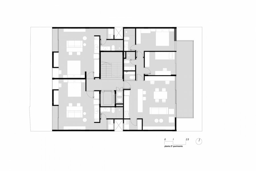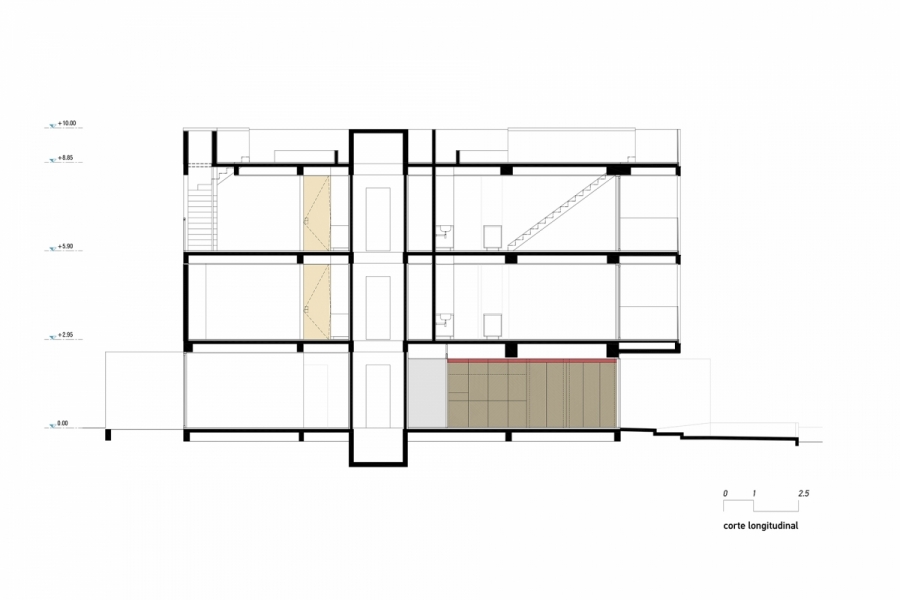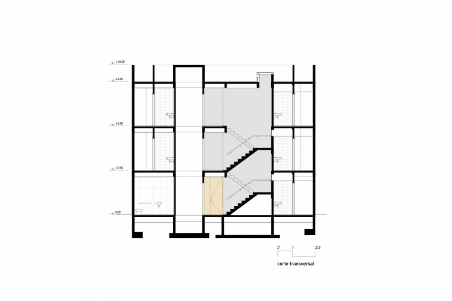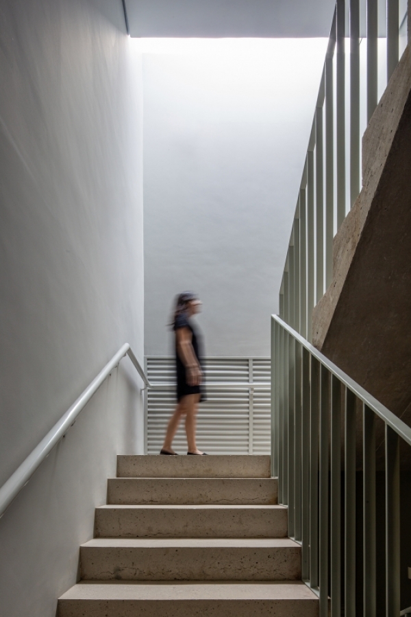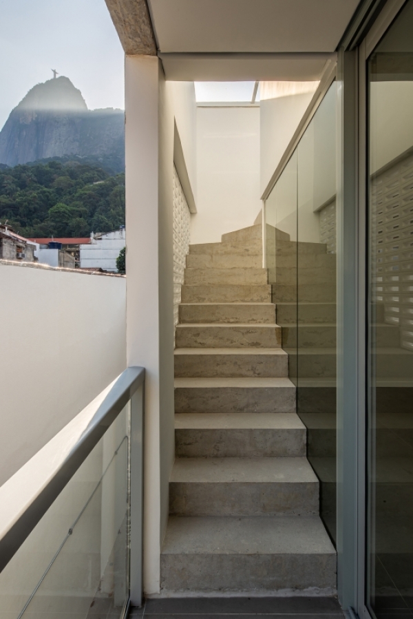 In the building's common areas, the choice of simple and unpretentious materials — such as concrete on the staircase floor, iron on the handrail, and wood on the doors — brings lightness to the circulation areas. A skylight positioned over the staircase allows natural light to enter, "lighting up" the environment.