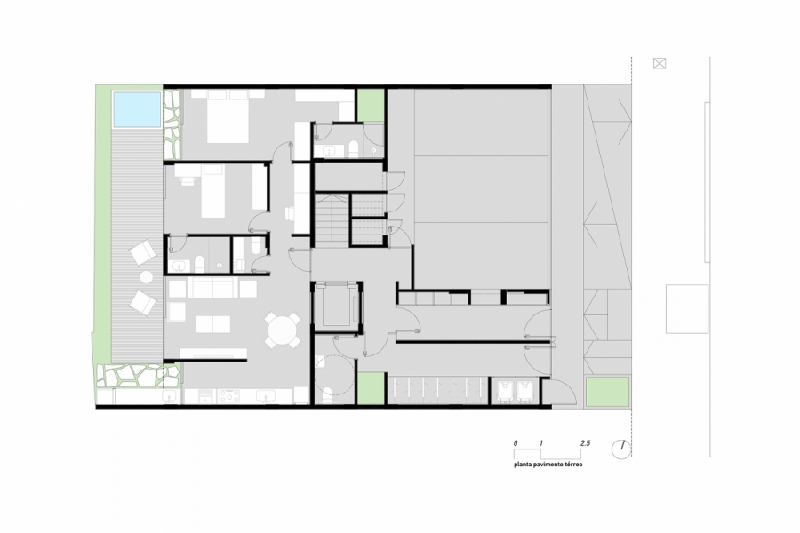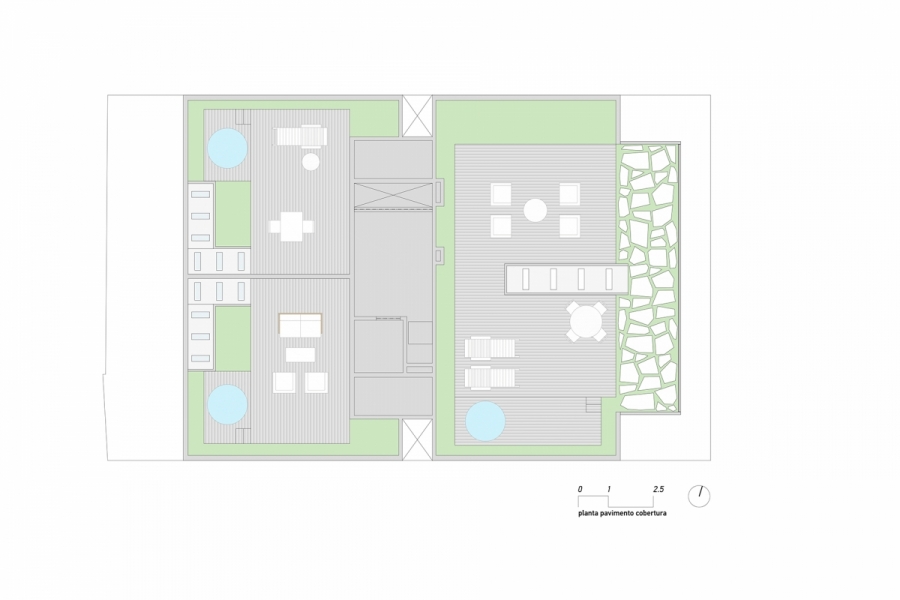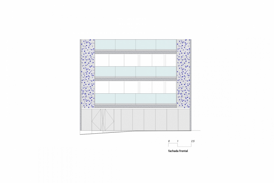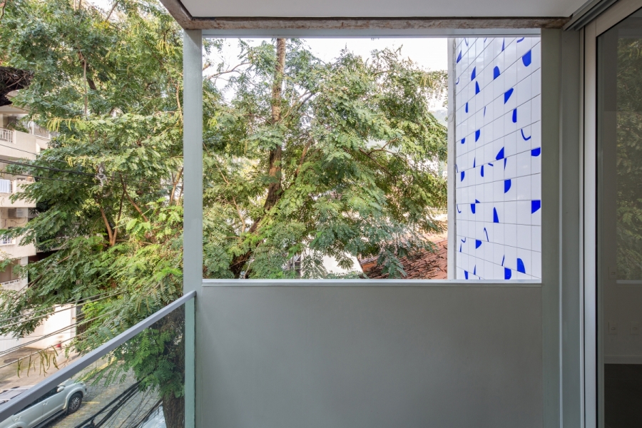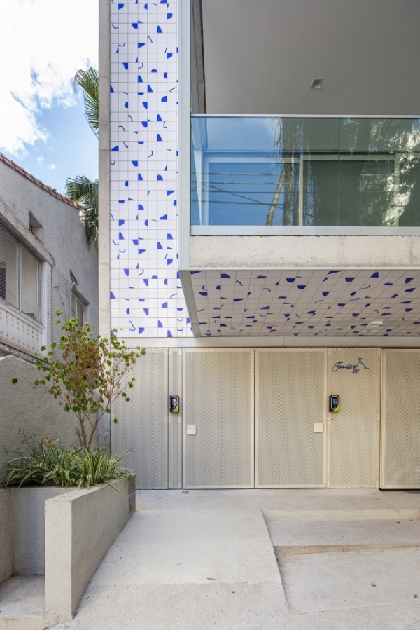 Janeiro 183 is a residential building with simple design and modest architecture, featuring spaces that enhance people's well-being and integration with the landscape. Its architecture reflects respect for the surroundings and the preserved bucolic urban ambiance of the street. The building's scale and cladding materials harmoniously integrate with neighboring listed properties. The façade highlights a tradition of Portuguese architecture, the use of tile panels, here reinterpreted in contemporary patterns. Glass balconies on the front façade connect the interiors to the street's vegetation, providing natural light and comfort to the indoor spaces. At the back façade, stairs leading to the studios' rooftop gardens are enclosed in cobogó, which protect the interiors from the afternoon sun and create a pleasant light and shadow effect.