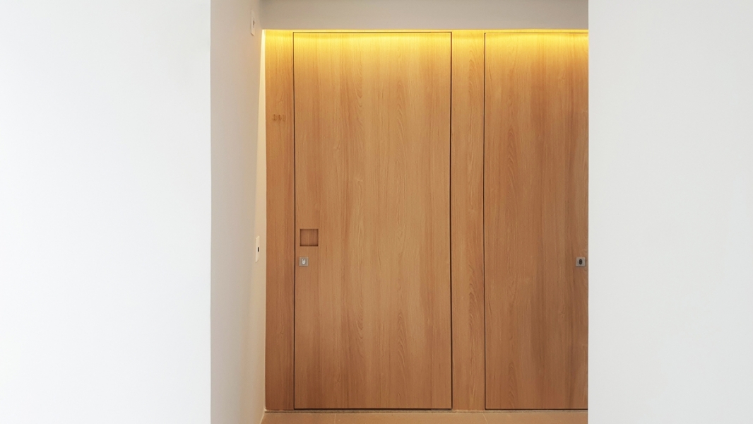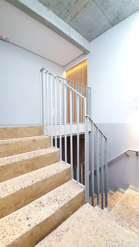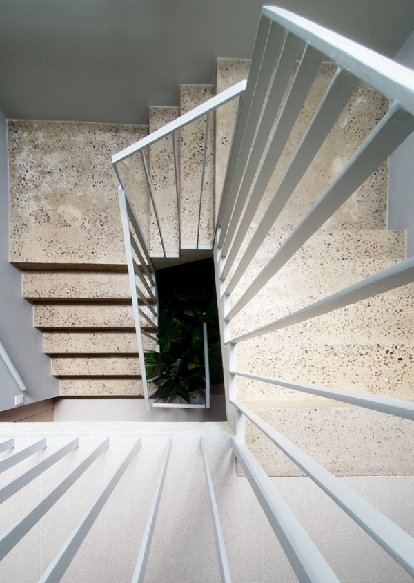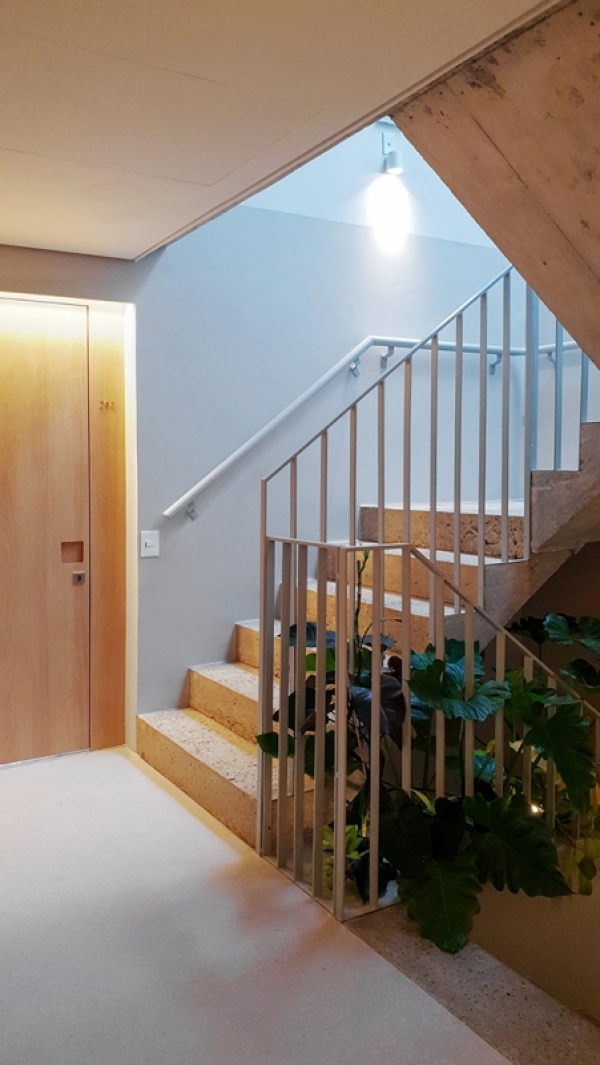 The skylight in the common staircase brings natural light to the circulation spaces and the small internal garden designed between the staircase flights. Wood, indirect lighting, exposed concrete, painted iron, and vegetation humanize the common areas and make them more relaxed.