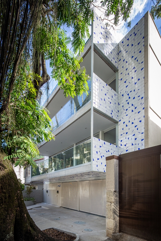 Janeiro 183 is a residential building with simple design and modest architecture, featuring spaces that enhance people's well-being and integration with the landscape. Its architecture reflects respect for the surroundings and the preserved bucolic urban ambiance of the street. The building's scale and cladding materials harmoniously integrate with neighboring listed properties. The façade highlights a tradition of Portuguese architecture, the use of tile panels, here reinterpreted in contemporary patterns. Glass balconies on the front façade connect the interiors to the street's vegetation, providing natural light and comfort to the indoor spaces. At the back façade, stairs leading to the studios' rooftop gardens are enclosed in cobogó, which protect the interiors from the afternoon sun and create a pleasant light and shadow effect.